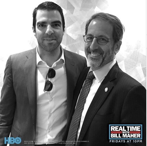 Actor Zachary Quinto and Prof. Jay Famiglietti on Real Time with Bill Maher, photo by HBO/Miles Leicher
