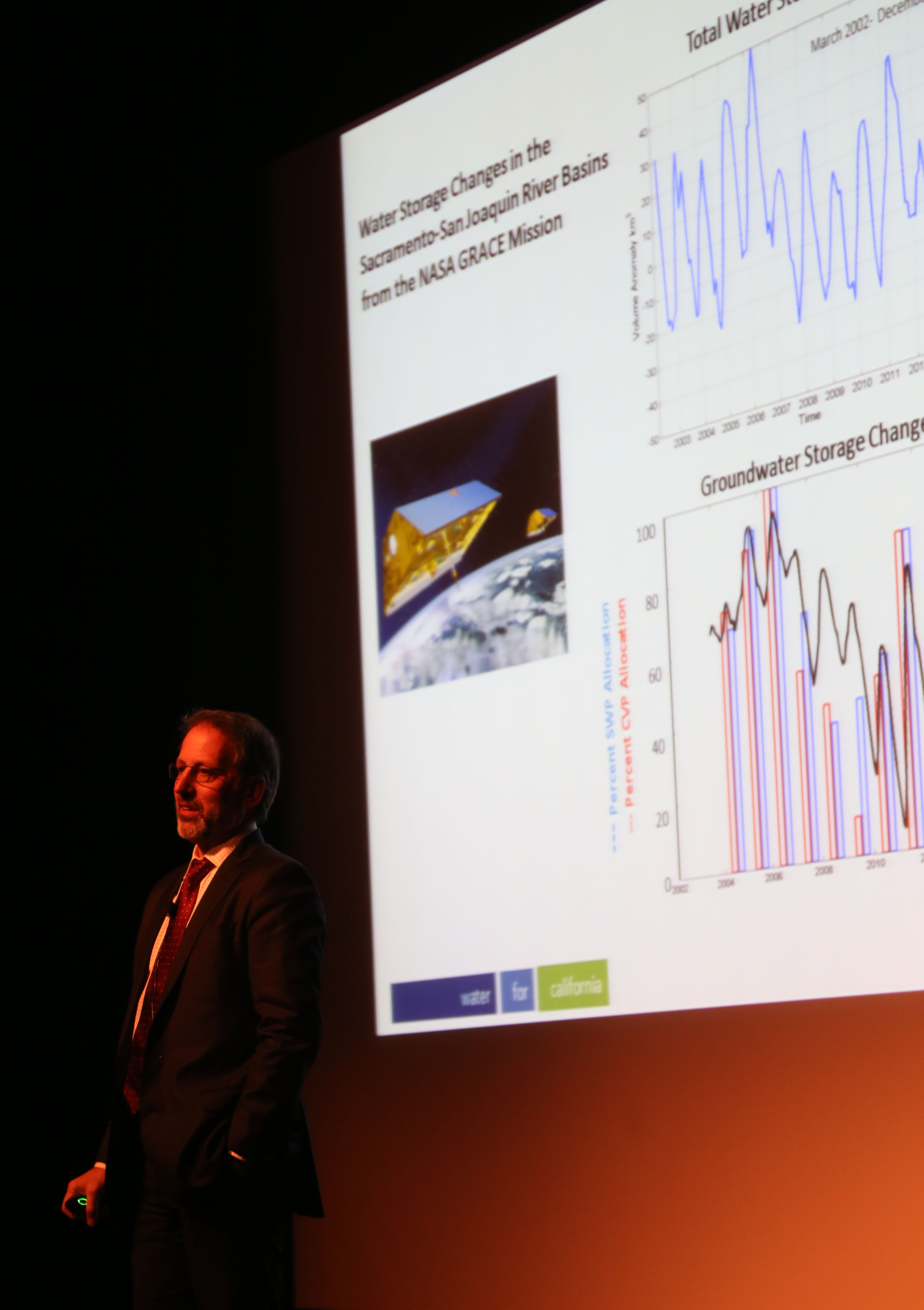 Hydrologist Jay Famiglietti speaks during a water symposium held at the Annenberg theater at the Palm Springs Art Museum,Thursday, March 20, 2014.