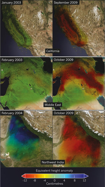 Over the years, the GRACE satellites have recorded massive water loss from aquifers around the world, as great as 4 cm per year (equivalent water depth) in some regions. From the papers by Famiglietti et al (2011), Voss et al (2013), and Rodell et al (2009)