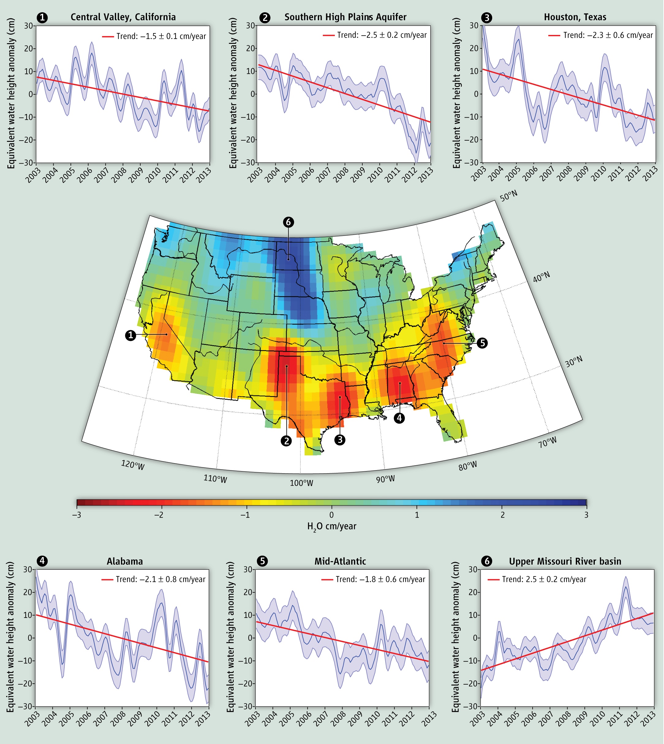 Changes in total freshwater storage from the NASA GRACE mission. From “Water in the Balance,” Famiglietti and Rodell, Science, 2013.