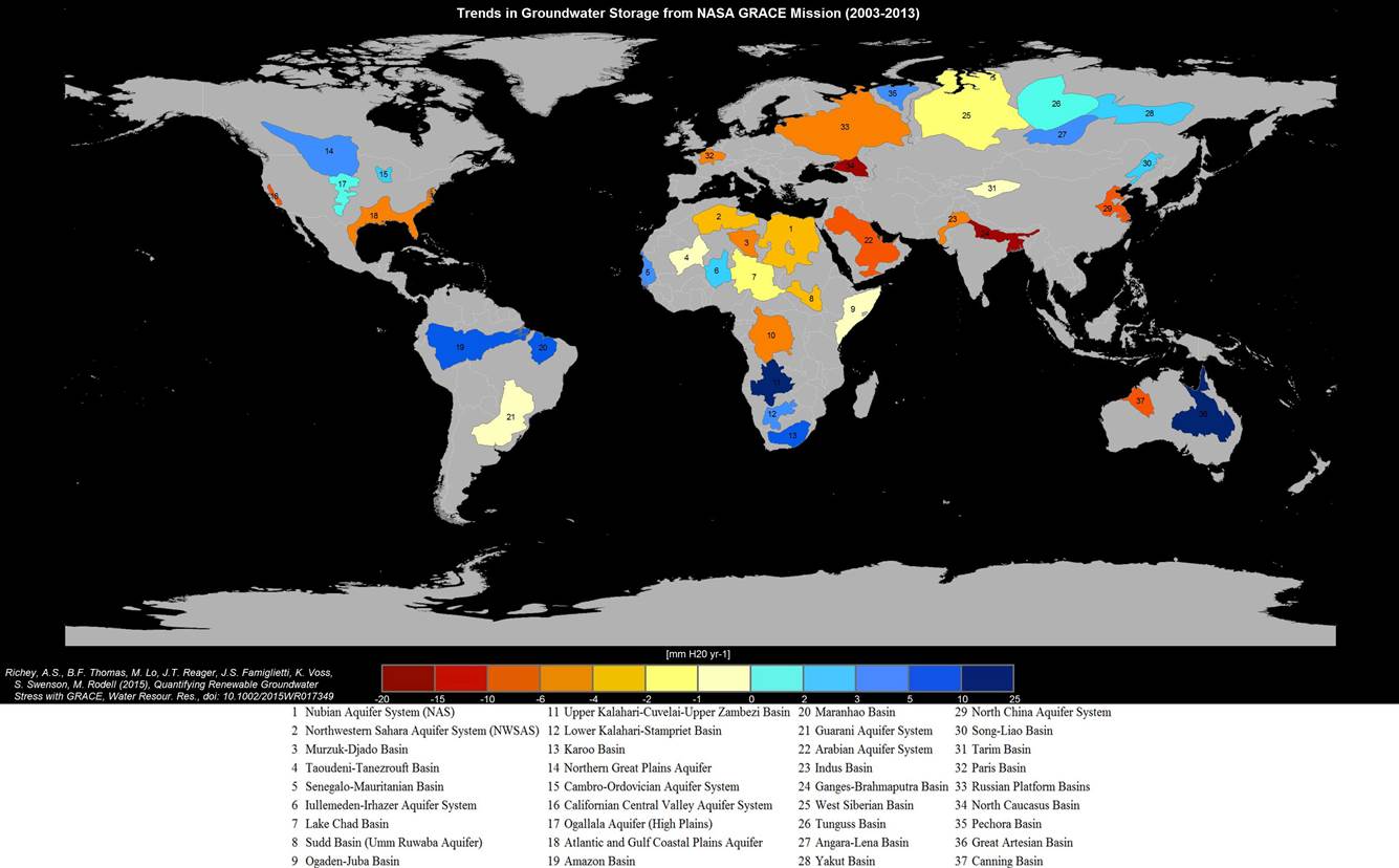 Trends in groundwater storage in the world’s 37 largest aquifers. Over half are past sustainability tipping points, meaning that more groundwater is extracted than is replenished on an annual basis. From Richey et al., 2015, Quantifying renewable groundwater stress with GRACE http://onlinelibrary.wiley.com/doi/10.1002/2015WR017349/abstract